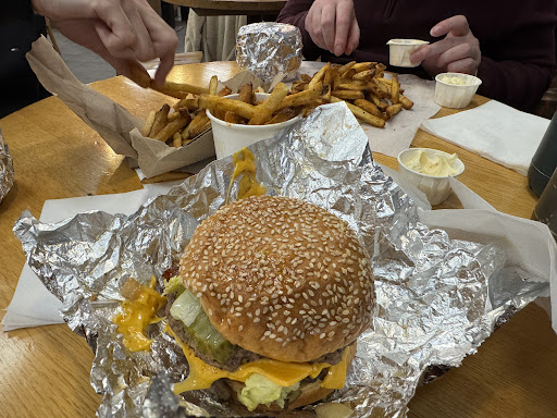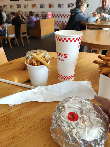 I'd never been to a Five Guys so this was my first (and now probably only) experience. The menu is above the till where you order. There was a queue of people and quite busy so I had to choose quickly. My daughter ordered a cheeseburger and I (who was hoping for something chicken as I don't eat burgers or sausages) very quickly realised the limited selection on their menu and opted for the "veggie sandwich" with cheese. The person behind the till was friendly and explained one portion of regular fries was plenty between 2 and with the free refills we could have 1 cup and 2 straws so I was very grateful to her for her advice. We then went to find a table which we just about managed but the table was greasy with bits of food on it. I then saw the other tables and worked out why. There is nothing to eat your food on. Not even a tray. Just a bag or some foil or a cardboard cup. Fine for the environment or if you were eating outside, less good inside the restaurant, and clearly the reason the tables were unclean. I then had to go and collect my food from the counter (stood watching them make it for about 10 minutes- if you've never been, think Argos but with food.) The staff were working hard and were polite and smiley. We then had to make various journeys across the restaurant to get a pot of ketchup and refill our drinks. The cheeseburger was OK, not dry and a good size. My daughter liked it. The fries were a good sized portion although some were in the cup and the others just thrown inside a paper bag, which seemed a bit weird. Why not make a big enough cardboard pot or box to hold all of them? The Veggie Sandwich was terrible. It was not a veggie burger as I had hoped. It was a burger bun (so not a sandwich) with green peppers, diced onions, sliced button mushrooms, a tiny piece of lettuce and a slice of tomato. The cheese was tasteless and the only thing it did was to make the burger/sandwich more greasy. The mushrooms and onions were chopped so small, they all fell out after one bite. It was not good. I ended up scraping everything out of the bun and just eating the slice of tomato with it and sharing the chips with my daughter. I really hope Five Guys decides to cater properly for those of us who are meat free or don't eat other things on their menu- they are missing a trick. The member of staff who was going around tidying the tables decided then to wedge open the doors of the restaurant, despite the fact that there is an Amber weather warning for wind, and this restaurant is right next to the sea, and the wind came in and made everyone cold. The wind then blew so hard the doors didn't stay open and started closing on people as they walked through them which I felt was unsafe. All in all, apart from the (mostly) friendly staff, it was a bad meal in a cold and unhygienic restaurant and expensive for what it was. Next time one of my kids wants a burger, I will go to Burger King, where I can choose from a range of food, use a clean tray to eat from and pay half the price for...
