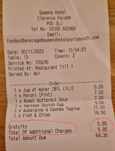 Read moreVery good meals in a lovely setting and the staff were excellent. My only issue is the concept of adding a ‘Gratuity’ to the bill. Dictionaries define a Gratuity as’ a tip given to a waiter, something given without claim or demand, something given voluntarily or beyond obligation, in addition to the official amount and for their red personal use, given freely as thanks for service. I think simply tacking it onto the end of every bill does not meet those criterion. You may say that I could ask for it to be deducted from the bill but why put that role or embarrassment onto your customer? It doesn’t even say “optional” or “discretionary “ Finally, by adding it to the bill and putting through your accounts it is liable for tax, thereby reducing the amount, if any, that goes to the staff. The sum in question is negligible and was paid, it is the practice I abhor. Queens Hotel has responded to my comments above but only addressed one of the 3...