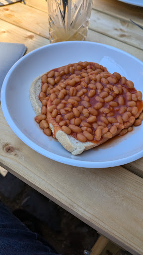 Bacon and egg door stop...... 2 slices of thin cheap bread with 2 slices of cold bacon with a fried anemic egg served on a wooden bread board in hopes to look fancy. Costing a total of £10!!