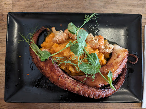 I took my wife here for her birthday after stumbling across the menu online. We were not disappointed. I had tempura pork belly to start which was fatty heaven, really amazing and came with apple sauce and a sweet chilli dip. My wife had the crispy shredded lamb with houmous for starter and the Brazilian fish stew for main. Both were again excellent. I had the octopus for main and whilst it was very tasty, by the end of the meal I was a bit tentacled out. The tips were crispy and delicious and the thicker end was fairly soft but the middle was slightly chewy and with such a large portion, I couldn't finish it. I also don't think the sweet potato added much. I think crispy fries would have been a nice contrast. That said, I'd probably order it again in future but we'll be returning to try loads of other dishes first. For 2 x starters, 2 x mains, a beer, large glass of rose, a very nice bottle of Portuguese red and 2 x double Courvoisier's to finish, our bill came to £125 including a service charge. I was more than pleased with that. Service was very friendly and the atmosphere really nice and relaxed. It was quite busy by the time we left but not at all noisy as the background music was nice and low. I did give some feedback to one of the owners before we left and he seemed genuinely delighted to hear it. A future favourite and we can't wait...