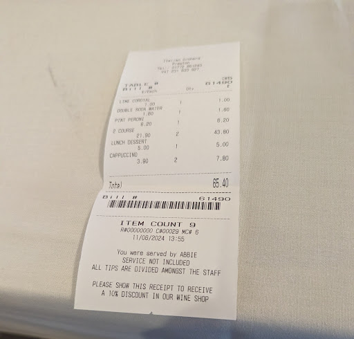 Our bill said our server was Abbie. No it wasnât. Since entering the building we had dealt with at least ten different members of staff. That to me doesnât represent good service and the paltry tip we left reflected that. To top it off the payment was collected by yet another different member of staff. Not only were we served by a ridiculous number of staff other things reflected on the service. No one asked us while we were eating if everything was alright. Unused cutlery was left on the table. My brothers empty pint glass removed but no follow up asking if he wanted another drink. You expect better in an establishment such as this.