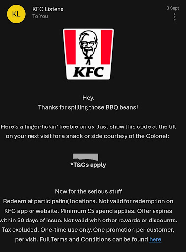 Everything is so difficult. You fill out thr servey to get a free side and when you try and use it, no one knows how to do it, you then get told to do it on the app even though you can't. It says on the email can only be redeemed at the till. Just make it so people can put the code in when they order on the app. Even though its a free snack, its not free, becasue all this free stuff kfc does gets put into there prices. And thats why they are so expensive. You ask for napkins and salt through the drive through and you never get them. Again that stuff has been put into the price of the stuff you buy. But when we ask for it we dont get it. It's coming to a point i now dred coming to pick up my order. As I feel like a pest having to claim my free snack and having to get stuff like napkins. Im not even going to bother anymore. You take my money but dont give me the stuff im entitled to without making it difficult and making me feel un welcome. I'll just be going somewhere else now. Not worth the hassle. Kfc doesn't even taste that nice anymore, always so oily and cold. First 1 star review I did you said to give it another chance. I did. And nothings change. This is not a complain about the staff. But at the management, you dont train your staff, and you make the free stuff almost impossible to reedem while making your prices completely over priced. I think youve intentally made it difficuilt to get the free stuff, so people will just not bother as its such a hassle, as its been put into the prices you end up making more of a profit. Shows how horrible the management are if thats how they decide to treat people. 20 hot wings 8 pound anf you can add 8 pieces of original chicken for 8 pound also. When this isnt a offer its 17 pound for 8 pieces of chicken alone. More than double. That just shows how overpriced this place is. Never coming back. Too much hassle. Over priced. And whatever you order. It's almost always barely warm