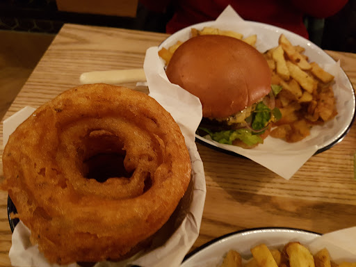 I once had a burger at honest burgers in London that was so pink in the middle that it was practucally raw and I hated it, so I asked for the burger medium well done this time around, and found it was a bit too dry unfortunately. Maybe if we go back I will have it cooked to their standard medium and hopefully it will be juicier. Food itself was good, but I think more burger in the burgers would be great. Was 30% burger, 30% toppings and 20% bun, which is disappointing. Drinks are ok. Gave us a cocktail without a straw, which was a minor oversight. Onion rings were huge and a little greasy, and expensive.