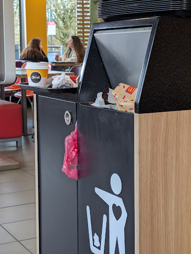 We went quite early evening and the restaurant bit was quite empty so we decided to sit in but the staff forgot our order and we had to chase it up fortunately there was one lovely lady worker there that helped us and sorted it out and was very helpful but the other staff members around just kinda stared at us, anyway we had to sit by the side of the toilets as my son wanted to play on the tablets they have in there and usually he don't get a chance plus there wasn't a space for my wheelchair anywhere around and nobody actually pointed out where else was suitable ,anyway we were tucking into our food and out of the blue the one worker decided she was going to empty the bin and grab the other bin bags that were by the bin as we came through the main entrance doors and then try to carry about 4 massive bags of rubbish through the door to the toilet catching me with the bags as she went through ,NO APOLOGY AT ALL !!! she then disappeared for about 20mins ,I take it that it was her break time , then reappears and just goes to the staff area at the front of the restaurant to chat to her friends !!! The floor was dirty and needed sweeping and there was no sign of wiping the tables inbetween customers or cleaning the trays or wiping of the bins etc yet she decided to empty the bins while we was eating ,surely she could of waited until we had gone ,they were not exactly super busy !!! Then when a group of 4 pensioners came in she couldn't help them enough !!! She took there food to them helped them order etc yet she couldn't help us !!! And I believe that everyone should get the same help who needs it , whether old or young or disabled ,just because I'm youngish and in a wheelchair doesn't mean I don't need help as much as a pensioner does !!! And as for the cleanliness ,I thought that mcdonalds claim that their restaurants follow strict procedures even more so since covid etc like cleaning between customers etc ,well tonight we witnessed none of this at all ,so please beware if your sitting in to eat perhaps take your own wipes and sanitiser All in all our visit ,which was a 1st visit in absolutely ages was very disappointing 😞,we won't be visiting again ,I would leave 0 stars if it...