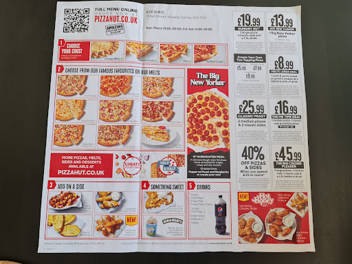 Read moreDecided to give Pizza Hut a go after a leaflet came through my letterbox this week. I wrote this review after two phone calls to the shop after an hour has passed and my pizza has not arrived. I have spoken with 2 members of staff one being a manager and found they were rude and useless. They could not tell me how long my pizza will take only that it is with the driver. Between the two calls were made I could have driven to the shop in that time! There website and leaflet advertises that the delivery will be within 30 minutes and if 10 mins late you receive a £10 gift voucher. I raised this with the staff who told me that it’s not applicable and not through them because they are a franchise and to take it up direct with Pizza Hut. Again just a joke. I don’t want the voucher as I won’t be ordering from them again but it’s the principle! I just wanted my pizza! I’ll be sticking to Dominoes next time. So.......my pizza finally arrived, and no the manager didn’t call me back to advise a time as he said he would. The pizza was awful that you wouldn’t even feed to a dog! So I rang the shop back to provide them with feedback and tell them how awful it was, when the phone was put down. They then wouldn’t pick up again! So I drove to the shop to return the pizza and seek a refund. I explained that as the phone was hung over I had no choice but to drive here. The manager (Richard) admitted that it was him and that the cord got pulled out so we accidentally got cut off! He must think I was born yesterday! The manager then stated that he can’t give me a refund as he was unable to and I’d have to take this up with HQ! Such a joke! And to add, when I attended the place had a dirty feel to it, and the section of the kitchen I could see you just know you wouldn’t want to eat from there. AVOID...