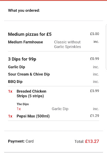 Read moreOrdered a pizza at 10pm. I have called only twice, on my second call, jay the assistant manager said he can give me 10 pound off. He then said he will give me 15 if I don't call again. So he is bribing me not to chase for a pizza that I expected over an hour ago that I have already paid for. I also am insure how I am going to get the 15 pound. He did say to reference his name "jay" and it will be sorted. The shop now closes in 20 minutes and no pizza. Also when I called the second time, he said its on the way. I mentioned that he said that ealier and he just said. Yeah I recognised the voice. This is unacceptable. If they don't have the staff then don't take the order or ring the customer and say, hey it's going to be delayed.