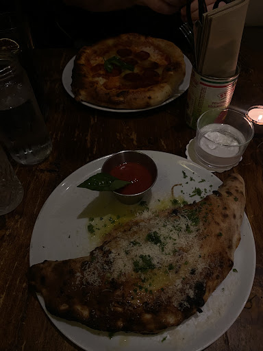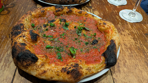 Booked for dinner on a Sunday and its a good job I did as it was so busy. As vegans its a very limited menu with nothing labelled, although they have vegan cheese but even the choice of pizza to adapt is limited. In the past I have messaged several times asking if any wines are vegan or could they send photos so I could research it myself but never had a reply. Anyway our table overlooked the bar, I took a picture of the wines and did a quick Google and found all were vegan. It puzzles me why they ignored my request, as it means more revenue for them. We ordered some olives, Marinara pizza and a vegan funghi pizza with no cheese as my husband isn't keen on vegan cheese and two glasses of Sassolino Bianco, followed by two glasses of Sangiovese. The olives are amazing the best ever, the pizzas were delicious, with the classic leopard spots on the crust typical of Neopolitan pizza. We demolished every mouthful then had two espresso coffees too also really good.