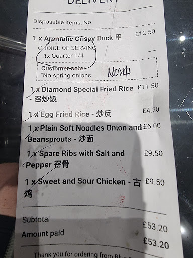 Read moreOrdered through uber eats and delivery time was suspiciously quick, ordered salt and pepper spare ribs and crispy duck with orange sauce. Salt and pepper ribs are absolutely tiny, barely any meat and no flavour other than the heaps of garlic used we only got 4 tiny bite sized ribs for £10.50 I feel it should 100% be mentioned if the ribs are small as I expected full size ribs which would have reflected the price unlike these which would have left the borrowers still hungry. The duck with orange sauce well it’s absolutely rancid, poorly packaged so it leaked all over the bag and packaging and the sauce was cold and thick and gloopy. The duck itself was soggy and tasted absolutely awful highly disappointed is an understatement will never ever...