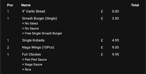 The Naga wings arrived coated in batter and smothered in a sweet, red sauce that seemed to be a blend of mango chutney, Naga pickle, and red food colouring, a horrible experience. The full chicken, divided into four quarters, was initially promising but quickly disappointed. It wasn't peri-peri as expected, but rather drenched in the same red mixture and excessively dry, making it difficult to swallow. The chicken was undoubtedly not fresh, likely from the previous night. The kobeda had a powdery texture and was also extremely dry, suggesting it was either from the night before or frozen. The naan bread accompanying the kebab was undercooked around the edges leaving it doughy, and the smash burger, although not as dry, was very bland.