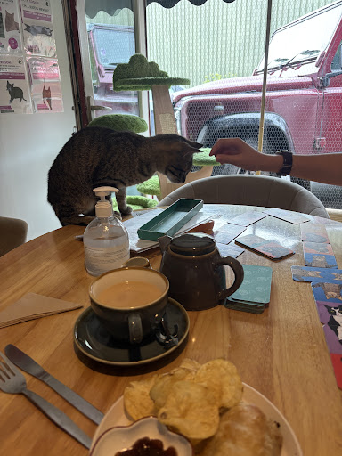 Read moreI took my dad for a visit here and we both really enjoyed it. Neither have been to a cat cafe before but I've wanted to for a while. The two staff were lovely and very welcoming. It was so special to be in the cafe area with the cats and I was pleased to see there's a separate room that the cats can go to if they don't want to be with people. Mostly they did! All with a different story to tell and all up for adoption (apart from the owner's cat who looked like top cat to us :-) The carrot cake was yummy and I loved that we were given small bowls of biscuits to feed the cats with, ensuring they were interested in us, and it was fun. There's a shop with all sorts of catty goodies and I bought two pairs of cute earrings, very reasonably priced. I loved the beautiful decor right through to teaspoons with cat handles, cat cushions, fun little posters in the loo, etc etc, and also all the diverse range of events that are put on through the week, including special days like Father's day. All in all a great experience. Thanks to the staff, they made it very enjoyable, and I was grateful to have the chats and learn more about what they do and more about the background of each cat, sometimes rescued from...