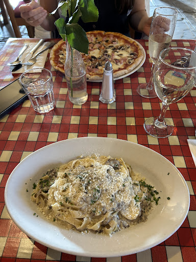 The atmosphere is authentically Italian, from the rustic stone walls and wooden beams to vintage metal plate signs, a classic moped, and beautiful paintings of Italian landscapes. Your table is set in the iconic red-and-white Italian cafĂ© style, and the background music, featuring accordions and violinsâtransports you straight to the heart of Italy.