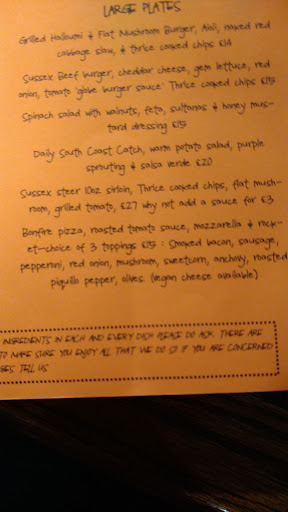 Read moreJust eaten here tonight Loved a atmosphere and decor And menu both veggie ,meat and fish looked amazing Me veggie hubby meat and fish He had fish soup starter and fish of day main loved it !! I had burrata started so lovely Main I had Wood fired aubergine dish which was undercooked and that was all with a sauce and rocket piled on top with a side of triple cooked chips which where ok Iate a fewchips but could not eat the aubergine as was too tough and undercooked When eventually our plates cleared I had to say about the aubergine as not happy Apologies and would feed back to chef Then we did not see waiter or have Another conversation then asked for the bill and my aubergine dish was charged on the bill to my disappointment!! So asked waiter if he had fed back ? He said he had and chef apologised but forgot to take it off the bill and someone else had also said the same I was left feeling really slighted not listened to and disregarded and will not return and something a never do is I did not leave a tip as for the sake of £9 for this dish One get the veggie food right and two if get it wrong acknowledge and rectify are...