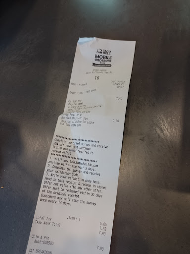 Read moreTaco Bell menu is fab and offers flexibility to customise your food which is a great idea. In theory this is a perfect alternative option for fast food instead of burgers, fried chicken or pizza. This is my 2nd visit to this restaurant and unfortunately on both visits my food hasn't been hot enough it was just luke warm which was disappointing especially as the restaurant wasn't busy. The drinks machine also has a smell of rotten drains (probably the drip tray underneath) and unfortunately it's the same today as it was the last time I visited approx 3 weeks ago - not impressed about that Taco Bell? hygiene standards? As I haven't visited any other Taco Bell restaurants I can't comment if this is the usual standard. It's a shame really as if the food was hot and the drinks machine odour free it'd be a regular haunt for me but I won't be coming to this location...