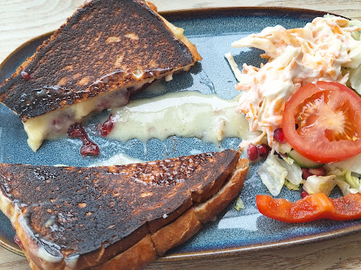 When we first entered, although we liked the interior decor and overall atmosphere, there was no drinks menu to look at. The coffee was fine but we ordered some food and were told that there were no chicken or prawns. Two of us then opted for brie and cranberry toasties which turned out to be completely black burnt on one side (photos attached). Obviously, the burnt bread was unappetising and probably changed the taste of the toastie for the worse. The brie was so runny that it was spilling out onto the plate and the side of coleslaw tasted like it was just full fat mayonnaise with some shredded carrot in it. Way too thick! We also ordered a cake that...