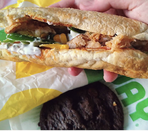 The new Subway TLC from eccles (tastes like chicken) I was mildly scared on my first bite. The texture felt just like chicken 6 scroll to bottom for pictures for a closer look It tastes like chicken too, it reminded me of roast chicken I ate as a child. I had it with plant based mozzarella slices, peppers, red onion, sweetcorn & garlic aioli I really enjoyed it after I got over my initial reaction of "oh god is this actually meat, has there been a mistake, best read the receipt 9 more times to check" The cookie was good too, it's sweet but not so sweet that it feels sickly sweet. It has a nice chewy texture, is that what all their cookies are like? I've never had a cookie from there before now Well done Subway. I also gave some to my partner (who isn't vegan) and he was impressed and said it was...