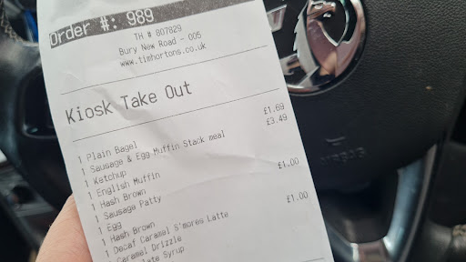 Read moreFood was alright in taste, bit bland but have had worse elsewhere, service was INCREDIBLY slow, no urgency or enthusiasm from staff present, I ordered at 9.05am got handed my cold food at 9.21am, there was a long line of people ordering before me too,one of which was a lady who only ordered a frappe which she had been waiting for before I'd even ordered and had to go up to the counter to ask about, the staff seemed somewhat polite just looked and acted as if they hadn't a care in the world about being there, just not much involvement or atmosphere from either of the two on and incredibly slow paced at working with no apologies for the wait in time to anyone that id seen, the shop seemed really clean and spacious which was nice to see but yeah due to an unnecessarily long and slow wait and with the food being cold which also didn't have much flavour in there anyway, I don't know if I'd return, I will say the promotional latte I got was surprisingly really nice as I'm not normally a fan of the Tim's coffee as its a darker blend I think than what I'm used to drinking but that drink I would definitely have again if I did find myself because here, im hoping if I returned the team working would put more effort and urgency into the experience, the wait time really was not justified as the shop was not overly busy and their movements themselves was just turtle...