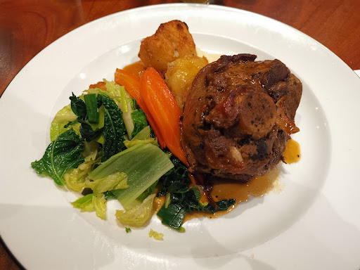 Once seated, we quickly ordered food for the kids, which arrived promptly. For starters, my wife opted for the pate, and she followed it up with the slow-roasted tandoori lamb for her main course. I chose the beef croquettes and the sirloin steak with peppercorn sauce and a side of buttered vegetables. We paired our mains with a lovely glass of Rioja wine, and all the food was fantastic.