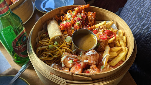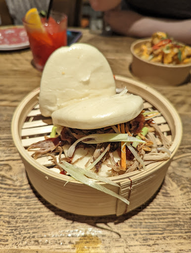 Lovely warm welcome in a relaxed and comfortable atmosphere with modern ambient music. The aroma hits your nostrils as you walk through the door and tempts you into ordering absolutely everything off the menu! We were greeted at the door with a huge smile and within moments were led to a group of tables and given our choice of seating arrangement; rustic wooden tables with a choice of comfortable mid-back chairs or sturdily constructed wooden benches with simple metal scaffold frames, or mix and match. I opted for the bench and was surprised at how comfortable they were. For food we selected a variety of dishes to try. First off we shared a portion of "Wok The Cluck" loaded fries - salt and pepper fries with breaded chicken pieces, fresh onions, peppers, spicy mayo drizzle and they were absolutely delicious! I'm not a fan of spicy food but the flavours were so perfect, not the sort to burn your lips off but still leaving lots of warmth and flavor to enjoy. Highly recommended! Next up we had Bao Buns. I went for the traditional duck and my wife had the Sweet Chilli Chicken. Wow... The buns were soft, moist and delicious and the fillings were plentiful and full of flavour. Fresh crunchy veg, sweet Hoi Sin with succulent strips of duck. I couldn't resist a bite of my wife's Bao Bun (don't be rude!) And oh my word, the flavor and the texture were absolutely superb. Sticky and delicious, crispy chicken with a little kick. My wife also had a portion of Buffalo Dumplings and she thoroughly enjoyed them... I've not seen her this quiet in a while, she ate one before I had chance to take a picture so excuse the absent dumpling! 😂 She is very well acquainted with Oriental Cuisine as her family is part Korean and she commented that they're some of the best dumplings she's ever tasted! For mains we went with the small sweet and sour chicken with fried rice (how western of me!) And my wife went for the small Garlic Chicken cutlets with noodles. The garlic sauce on the noodles was delicious, soft and succulent chicken with a subtle and not overpowering garlic flavour. The noodles were also cooked to perfection. The sweet and sour chicken was to die for! Lightly battered individual bite size chicken pieces covered in one of THE best sweet and sour sauces I've ever tasted, served on a bed of hot and sticky fried rice. I gave up with the chopsticks and reached for the fork as I just couldn't shovel it in quickly enough 😃