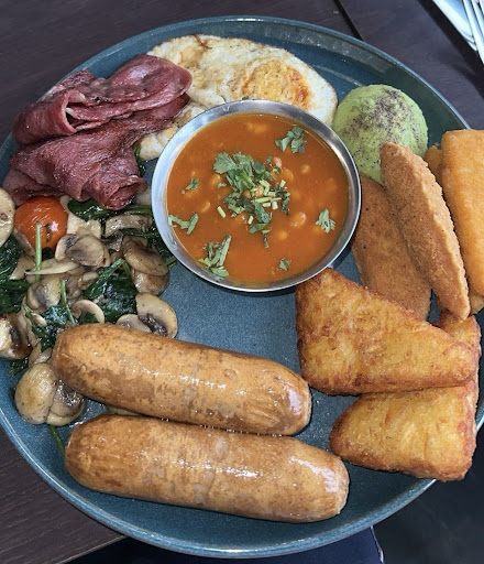 The sausages were succulent and full of flavor, providing a satisfying start to the meal. The hash browns were crispy on the outside and tender on the inside, cooked to perfection. The addition of spicy beans, served in a stylish metal bowl, added a comforting touch, with just the right amount of seasoning.