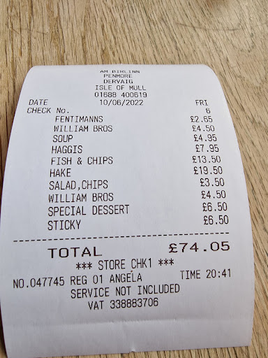 We were driving past and decided to stop for lunch, the board outside said reservations advised but there was only 3 cars in the car park so we thought they could accommodate us and so they could. A light airy restaurant with tiled floor and lots of windows looking onto the surrounding trees. There were only 2 other couples inside and we were quickly seated and served our drinks. I decided to have a starter of soup of the day which was leek and potato, my wife chose a smoked trout with cream cheese and cucumber ciabatta from the lunch menu. The soup was very tasty and came with a couple of slices of what tasted like homemade bread which was excellent. My wife said her ciabatta was really good and I could tell because she finished it all. For a main I chose Spanish seafood stew and I'm so glad I did, heaven in a bowl. Salmon, scallop, chorizo, courgette, aubergine and langoustine in a tomato and smokey paprika broth and there was plenty of it. With bread also available I would say if you're hungry, go for it. After that I couldn't find space for dessert but my wife went for cheesecake with raspberry coolie, it was a huge portion and it too was completely finished. In conclusion, if we're ever back on Mull then we will certainly return to the Am Birlinn, best food we had...