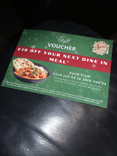 Ashoka south side. Where to start. Booked initially for Christmas Day where was promised a glass of fizz on arrival. Upon arrival you were offered a mocktail. Only once I had questioned this and thankfully had my own copy of the menu, was this granted. 2 weeks before Christmas Day we were requested to pay in full for our meal. Understandable, but why was I asked to pay in full in cash? When I said I only had card, I was told the cash machine was just up the road. Seen other people pay by card, so don’t know what this request was all about … On Christmas Day we were sat at the seat beside the window. Food was enjoyable and would have recommended only for the fact they had over booked and took my dads seat away. We were left sitting like 3 wee crows sitting in a wall all squashed on the couch at the wall at our Christmas Day dinner. Staff were pleasant and we were understanding about the situation. The food is nice in the Ashoka, but usually luke warm. On Christmas Day I had to ask for my chicken to be reheated. Nothing comes to your table piping hot we have found on our multiple visits. As a thank you, we received a voucher for £10 off our next meal in the Ashoka. As January is a gloomy month, we thought we would take up the offer and go for a nice meal. Please see picture of voucher attached for reference. On the voucher it states that there must be a MINIMUM of 2 people to use this offer. Your staff member seemed rather confused, and stated that it could only be used for a MAXIMUM of 2 people. Also we ordered from the pre theatre menu. When we first arrived there was no mention of the pre theatre making this voucher void and this was only discovered when we went to pay. Your staff member went on to say that there was t and c’s to go with this voucher as stated on it, but upon request to view these, there was none. She said there was no t and c’s and that she would bear in mind and put this exemption on the voucher next time. It seems like the t and c’s are just made up as the day goes on. Our bill came to £87 so with the voucher it would have been £77, which is still a considerable amount. We usually leave a tip of at least £10 so therefore it actually woukd have been given back given the chance. I’m in the fortunate position where I have studied International Business Law and can herby conclude that this is breaking the law as you have failed to clearly state the t and c’s of this voucher. Your staff member stayed persistent that we were not to get the discount, therefore I shall not return to your restaurant. The food is nice, but not something that I couldn’t find elsewhere. I’d prefer to find somewhere that values my customer loyalty which from my experience in here, you don’t. A shame as this is a local restaurant and we had high hopes for it. Good food and within walking distance so what’s not to like but what’s...