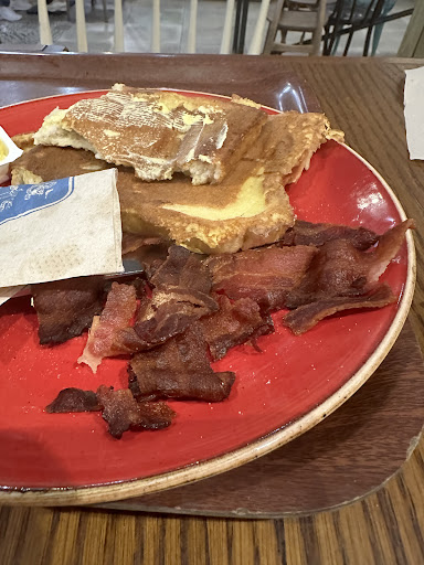 I had the veggie breakfast and a milkshake and my wife had the pancakes with bacon and a tea. We were the only people in there but the service and food were very good and the sausages on the veggie breakfast were a refreshing change from the usual offerings at other places. The only criticism I would have was that we appeared to have sat at a table that hadn't been wiped properly on the previous shift as there were bits of salt across it - no big deal though. Each table along the wall has a USB plug socket which I would make use of if I were a younger, more fashionable person. It was quick and good value for...