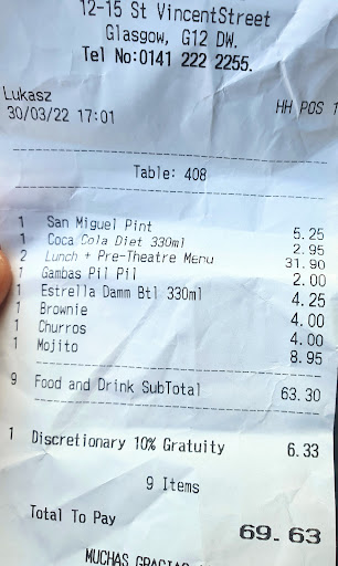 Read moreas a vegetarian I was really looking forward to ordering the patatas bravas and the Spanish omelette as I’ve had these dishes before and really enjoyed them. I was shocked when I learned these two items are not actually vegetarian friendly as they are cooked in the same oil as the meats. Seriously? Potatoes and eggs? Two of the biggest foods vegetarians eat and they aren’t vegetarian here. There were other options on the menu which I had to order instead however I did not enjoy them at all and unfortunately had to waste a lot of it and they certainly weren’t worth almost £8 each. I have a mild dairy intolerance and found a lot of the vegetarian dishes were heavy on dairy. I thought about ordering a vegetable paella instead however the menu stated they were for two people and also there was no option for just vegetable paella. very limited menu for someone who doesn’t eat meat. very disappointed with my visit tonight. to top it off our table order of drinks, half of them never arrived despite asking twice for them and also we were missing a side order of bread which never arrived despite asking twice. one server who I assume was manager was very lovely and apologetic and we were able to resolve the issue with the missing items however from the start my night was already ruined as I really didn’t enjoy my choice of food. I had been raving about this place for a while before visiting and was very much let down and I will not be back unless there is a change in the vegetarian menu. There was a 10% tip included on the bill and my group of 8 all agreed not to pay it as we weren’t overly happy with the experience. I left the place barely eating a thing, wasted £21 and ended up ordering chips from the weather spoons...