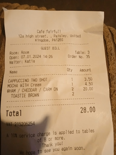 Β Β Β Read moreOrdered from this cafe off just eat at 2:30pm. I phoned the restaurant an hour later to ask how long it will be as the estimated time kept getting later, they said it is the just eats fault as they are ready on their side ( which we were fine with and agreed ) another hour goes by so I phoned again and the lady said the driver is on way to the restaurant and will be there in 5 minutes, she also stated they will re make our food as it had been sitting for 2hours ( we were very reasonable and said that was fine ) food came finally and it was not a shock. Chips are stale and stuck together and pretty much cold, definitely was not freshly made and was most likely the same batch that had been sitting around for 2 hours. Left waiting forever for our food for it to be...
