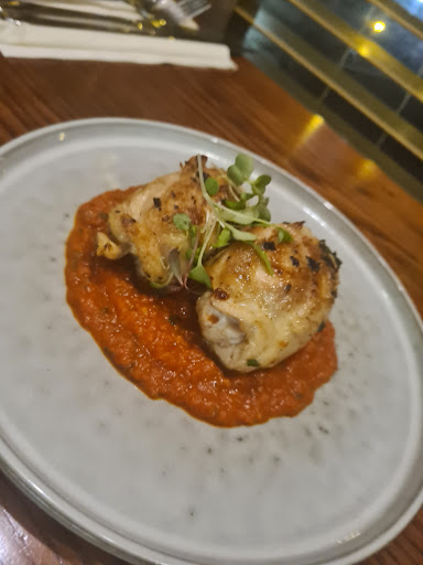 the special of calabrese crispy chicken thigh - calabrian njuda and pepperoni sauce. Uovo cotte con prosciutto- poached egg with roasted peppers, peas, chilli, napoli and garlic bread