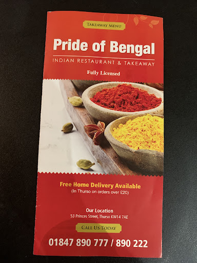 Read moreOn our first night in Thurso we all went to this great restaurant. I like a pretty hot curry and as I have eaten here several times in the past I had my favourite dish being a chicken pathia madras hot. Well it was brilliant as usual lovely and hot with plenty flavour . We were up for the fishing and on our last day we all went back and I had to have the same dish and again it was delicious đ My local Indian restaurant The Radhouna has just won the best Indian restaurant award 2023 and I have to say the Pride of Bengal food is equally as good and would give the Radhouna a run for their money. The manager / owner Hassan is so friendly and makes the evening enjoyable. đ will be back...