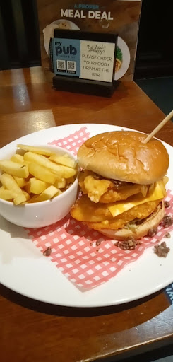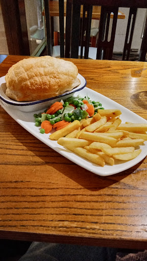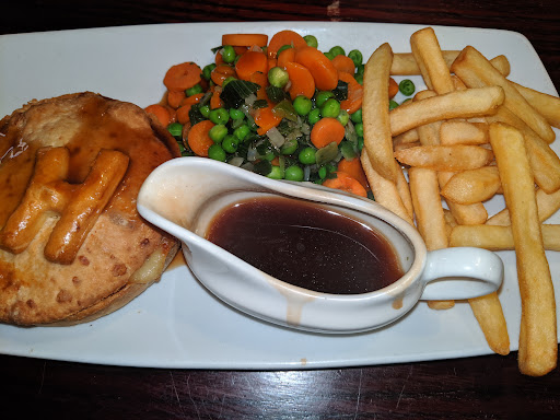 The food, well, Burger and Chips portion was tiny, even for the reasonably small price it cost. The Chicken your way was a chicken breast and chips with your choice of toppings, cheese, Mexican hot sauce and bbq sauce, only 1 of which was actually given on the dish and the chicken was really dry. Lastly, BBQ Wings and Steak Pie, the BBQ Wings were actually amazing, the sauce was nice, though it could of done with a little more but the chicken was moist and crispy. The Steak Pie though, the pastry was over cooked and dry as hell, the chips were overcooked and the veg was not even worth writing about. The steak itself was nicely cooked but the gravy...the gravy is not red wine in the slightest and if it is then its been cooked to hell and drowned out by stock, its not fresh and I'm sorry to the chefs but if its home-made it's bloody awful, the gravy was like black jelly, far too thick and the flavour was that of cheap stock cube and it was glossy.
