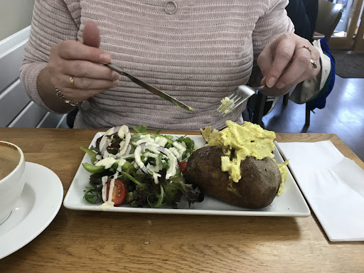 After parking, which was easy, we entered the eatery and was greeted, firstly by the amazing aromas of coffee and food, then by our lovely waitress with her warm welcoming smile. We were seated... by the radiator, I might add! We were given our menus and a drinks order taken, which was a flat white with caramel along with a latte. My latte was very welcomed with cold open hands awaiting eagerly for the heat of this, what turned out to be, well, hot liquid velvet. It was wonderful. Our food order consisted of the 6oz burger with bacon and cheese with the largest chips I have ever seen. Like, I mean take an old Nokia and cut it in four...I kid you not, they were huuuge. Sadly, I didn't capture a photo... There wasn't time for that, i did get the cakes thoughđ. I decided on having a tuna melt. After having clocked the cake counter, I was for sure leaving room. It came served with coleslaw and side salad, which looked amazing. Now the best bit...cake. I had for myself, after a lot of indecision carrot cake. It really is as good as it looks. Dense, moist, fruity, spicy and buttery, a small slice of heaven on a plate. My partner had a fruit scone with jam and butter. It was also large, waaay bigger than a tea cup! I didn't get a taste, but it looked really good. The spiced pear scone was my other choice. I feel that the prices are very fair in return for what you get. Great food, great atmosphere and great staff At the end of the day, I have my doubts about eating out. Very few places " thrill me" truth be told. But this wee nugget did just that. I can't wait to go back to sample more of that amazing food, a huge kudos for the kitchen is deserved. You really will have to find out for yourself...til I go back and...
