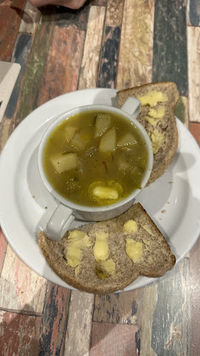 We came here on the recommendation of our hostess at the B&B just down the street. We were warmly welcomed, seated within moments, it was next to the bar/service area but that wasn’t a problem whatsoever. After a nice perusal of the menu we ordered , drinks, and food starting with potato leek soup to share and two orders of their haddock fish and chips