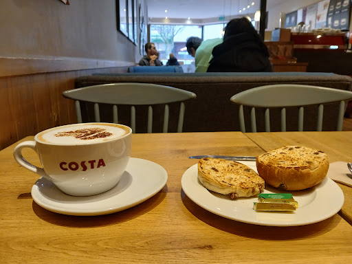 Nice service with selection of cakes. Area seemed clean and toilets were in good condition. High chairs of wooden variety so straps could be a little better. Seating is good choice of shop front., back and outside with parking just round the corner and across from bank. As typical with costa takes apple and Samsung pay with all major credit and debit cards and contactless. Prices still quite high for what you get but ok for a treat or a light snack. Now does music...