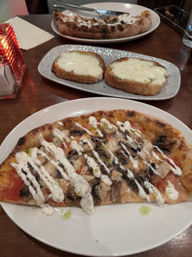 We ordered the garlic cheese bread, but it was completely flavorless—there was no hint of garlic, and the cheese was just bland. It was so unappetizing that we couldn’t even finish it between the two of us. We also ordered a chicken pizza, but when we asked about the sizes, the waitress was unsure, and even the waiter couldn’t provide a clear answer about the menu, While both staff members were friendly and welcoming, their lack of training was evident. Throughout the 45 minutes we were there, we kept hearing glasses breaking, plates dropping, and cutlery clattering, which became quite irritating.