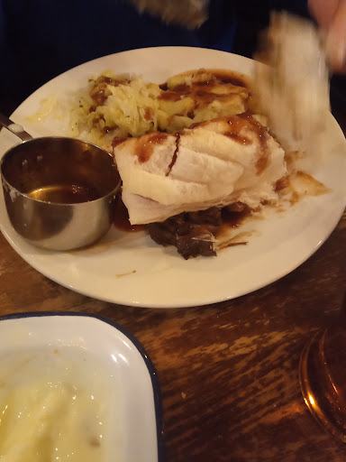 Anyway, ordered food. A starter/sharer between all 3, and 3 mains. It all came at once. So not great. The attached pictures are what they call "steak and ale pie" on the menu. Few bits of meat and a small piece of anemic puff pastry. I've seen other pictures of this dish in reviews, with lots of meat, a lovely looking gravy, and a nice big blob of puff pastry. Whilst a PIE is NOT what is on offer here, they at least looked appetising and hearty. This effort was a very poor. I've had better for £3 in the Horseshoe.