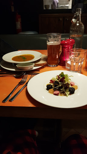 Overall the food was above average, the service was good and the restaurant itself was impeccable. The restaurant is positioned behind the Tennants brewery and if you didn't know it was there you'd probably miss it. The courtyard was quaint and immaculate and reminded me of a lovely summer beer garden. When my partner and I entered we were greeted quite quickly and shown to our table, the server didn't tell us her name but she was really friendly. We were given the food menu and a clip board with the list of drinks. The drinks list was on about 6 or 7 pages and advertised a large selection of larger, IPA, stout, wines, spirits and coffee. Our drinks order was taken (larger was off the menu tonight so I opted for the Apple IPA instead, very good considering this is the first time I have drank an IPA). Then, our food order was taken by a different server who wanted to get us drinks, obviously some miscommunication between the servers. I had the Mackerel to start and David had the soup of the day (tomato and basil), the appetizers were phenomenal and I can't recommend them highly enough. The mains were a little different, I ordered the sweet potato and falafel burger which was flavourful but somewhat dry, I had to keep taking a drink after every bite, David's fish and chips were good and the standard for most places but the batter was a little soggy. My observations of the open plan kitchen was that most of the chefs were very sanitary and would clean after every plate left the pass, one thing I did notice was one chef carrying a dirty tea towel on his shoulder, which any chef would know is a tad unsanitary. The restaurant was 5* for cleanliness and all plates, glasses, etc were removed and the table cleaned as soon as the customers walked out. The bill came to £45 for 2 starters, 2 mains and 2 pints, not bad at all in my opinion. Also I'm extremely picky about restrooms and I have to say that, although they need a good lick of paint, they are kept to an impeccably clean standard.