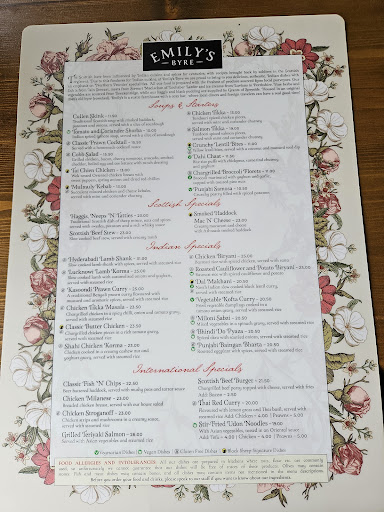 Read moreTraveling with my family we have found it difficult to find a restaurant in the area that can satisfy our palettes. Thank goodness we stumbled across Emily's Byre. One of the most charming establishments we have ever visited, the only thing more impressive than the numerous types of food choices available, we're the rich flavors we enjoyed, each cooked to perfection and accompanied by a truly outstanding level of service. I had the Scottish Stew (Scottish), my wife and our youngest son had hamburgers with fries (American), and my eldest son enjoyed an Chicken Biryani (Indian). My stew was extremely flavorful and well-balanced and the beef exceptional tender. Each dish was cooked to order. No next day reheating of items here, as no items were dry or over-cooked. Not only was the Chicken Biryani and Scottish Stew outstanding, but even the burgers were exceptional. I savored a fine Scottish Scotch Whiskey following my outstanding stew. I cannot recommend Emily's Byre enough. It is rare that I am so pleased, but even more so when my family agrees. I strongly recommend Emily's Byre for anyone...