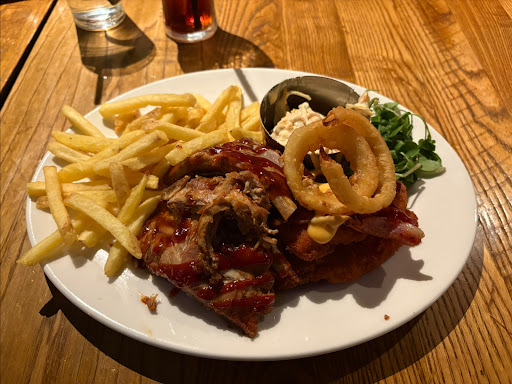 The BBQ chicken stack was two crispy chicken breasts of poor quality with a single strip of bacon, a teaspoonful of melted cheese and seemingly the dregs of a bbq sauce bottle so it was rather basic and dry for most of the meal. The semi-warm fries, couple of onion rings, slaw & rocket will help fill you up but fail to improve the meal any. The optional half rack of ribs on the side were actually not too bad though. Well cooked, soft and somewhat tasty.