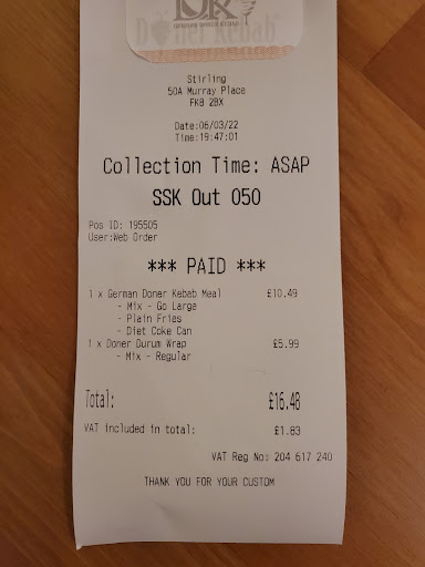 Ā Ā Ā Read moreVisited here yesterday, have never been to any of the German Doner Kebab stores before but have heard positive things so me and my partner decided to give it a try while we were in Stirling. Restaurant is big and clean, good first impressions as soon as you walk in. I ordered a mixed kebab with chips and cheese sauce, this also came with jalapeƱos on top, and my partner ordered a mixed wrap with chips. We also got 2 spring rolls to try, one chicken and one beef. We both decided to get drinks: a large mixed tango ice blast and a can of iron bru. We ordered on self service machines and this was easy to do. We sat at our table and drinks came super quick. By the time I had gone to the toilet and came back the food was arriving at our table. Speedy and amazing service! The guy who served us was great at his job! Food was amazing! Portion size was quite small for the price paid but food was still good. I wasnāt feeling too hungry today so portion size was ok but usually would want more food. Cheese sauce was really good, one of the best Iāve tried. Would probably...