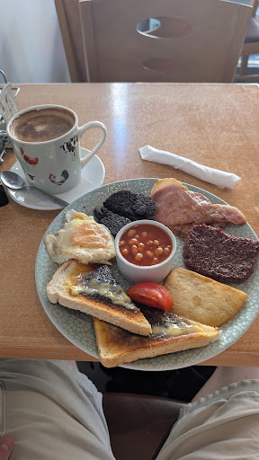 Read moreGreat western breakfest - egg, beans, toast, black pudding, square, poatoe scone, 2 slices bacon, tomato + coca cola in a bottle to sit in.. 12.50£ !