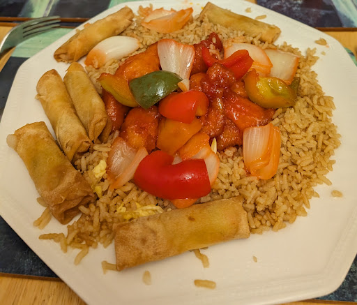 Not enough chicken, nothing like it, in the Sweet And Sour Hong Kong style. Mostly just nearly raw onion and some peppers and about 3 bits of pineapple, in a really watery and mostly tasteless sauce.