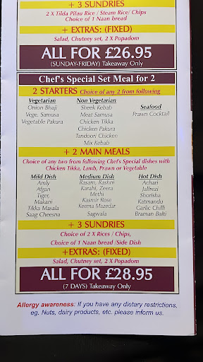 Read moreHad a meal there last night with a a group of ten friends. The staff were very attentive and helpful. Our waiter sorted us out with a sort of set menu where we got a mixed starter, main of choice and plenty of rice and naan breads for the table. Food was great with no complaints or faults found by any of our group. Cost was reasonable at about £25 a head including our drinks. Most people had 2-3 beers and the drivers had 2-3 sort drinks. Portion size is pretty big so smaller appetites could definitely share a portion. I ordered chicken vindaloo and garlic rice, it was spot on taste wise with the perfect amount of heat. I'd recommend booking a table with a...