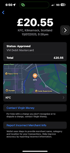 Went to treat my sons at local KFC Kilmarnock paid with Apple Pay at drive-through got a receipt straight to my phone from Apple Pay saying you have paid £20.55 at KFC, at Queens Drive Girl at the till said sorry the machine didn’t print me out a receipt then she said it looks like you have not paid for your meal. I showed her the Apple Pay receipt which you can send straight away to your mobile phone when you have made a purchase. I also backed that up by showing her my bank details with the payment on there as well same time same location same price but she still said payment is not going through I was not to get any food for my sons. I was to go back in five days after the money is not been transferred back into my account I asked for the void receipt to prove it’s not went through on their end she declined and also manager Caroline area manager so cold to be said the void Receipt is only for her till only And I’m not allowed a copy of the void Rashid for my own records the only receipt she can give me was the receipt you get when you order your meal with your meal saying exactly what you paid for and it says at the bottom how much was charged to your method of payment? No wonder kfc got excellent reviews on Google review well done KFC Kilmarnock you bumping ———————— what is your contact information for KFC and I will reach out to you manager didn’t give me any information to contact to...