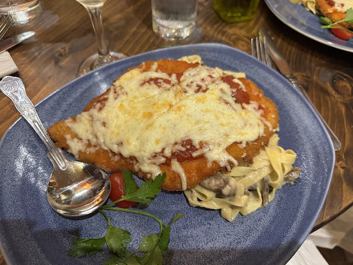 The food itself was good but there were a few issues. I am reviewing everything we had. For starters the rosemary focaccia (FOCACCIA AL ROSMARINO) was excellent and very generous portion . The calamari (CALAMARI FRITTI) was slightly chewy. The bruschetta was very good. ARANCINI was good also. For mains, three of us had POLLO GRANDUCATO and the chicken breast coated in light breadcrumbs, pan fried & topped with tomato Napoli sauce, fresh Mozzarella was very good but the tagliatelle in a cream & wild mushroom sauce was overcooked which was disappointing. Two of us TORTELLI with porcini’s mushrooms was nice but overcooked also. For dessert, we had tiramisu which was lovely, affogato which was very good, cannoli very delicious and lemon sorbet which came in a Prosecco glass (not sure about this would be better if this was served in a different glass as it was odd to eat out of narrow glass).
