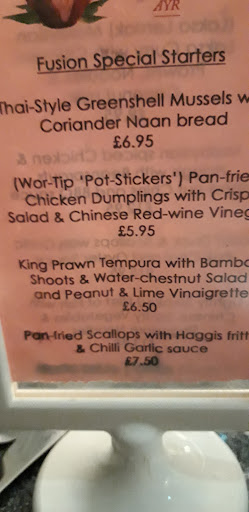 Read moreI visit the " Lychees " restaurant as often as possible on my short visits to Ayr. The service in this restaurant, in my opinion, is very good. I would normaly opt for my favourite starter of ch/sweetcorn soup, but on this occasion I decided to push the boat out and go for the " pan fried scallops with Haggis fritters and chilli garlic sauce " , It was an inspired choice, the pan fried scallops were amazing, and the Haggis was so light and tasty it would have your taste buds dancing with delight. My other half tonight, chose the " lightly smoked fillet of fish with chinese stir fr for the mains, and there were no complaints there. I went for the traditional breast of ch/curry, and was not disappointed. All in all , with a large beer, a large glass of wine, a coffee and a Bailly's latte for less than £50.00 very good value for money, can't wait for...