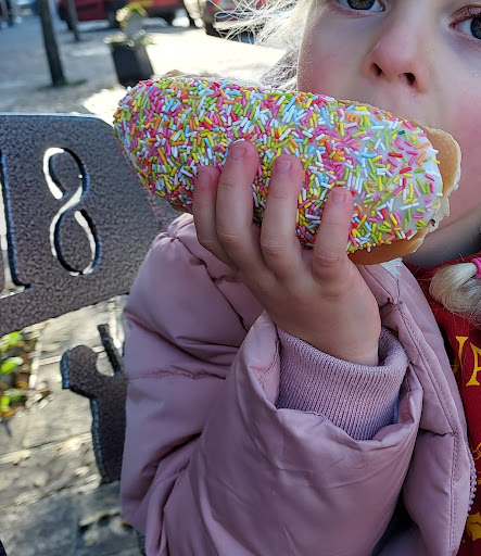 My little lass a sausage bun and a iced finger..