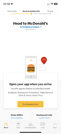Read moreOrdered online on the McDonaldâs app to pickup, the order was accepted, but when I turned up there were three big bins in front of the drive through and the main entrance door was locked. Which means I could not cancel my order because it had already gone through. Meaning I lost my 8000 reward points because they didnât have the decency to declare the premises as closed as they should have done.