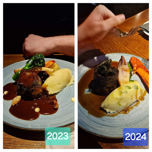 Son and partner both ordered the Braised Blade of Beef. When both dishes arrived, we could instantly see it was a different cut of meat than previous visits, and the jus was watery and see through, the veg sides had changed, and so had the mash, but the kicker for this meal was the beef. Usually, a beautifully cooked piece of meat that melted melted away. What my son and partner cut into was absolutely disgusting so much, so I told my son not to eat it. As he got to the middle, it was slimey jelly like fat, coming away in strings on the fork. It was vile, and at almost £19 per meal, it's an absolute disgrace. I had the Pepper Chicken, which has also gone downhill. Normally soft and juicy, it was dry and tough. The peppercorn sauce has changed and in place of the tenderstem broccoli was 2 small florettes that were crunchy and hard to eat. Again, at £16.50 it's not worth the premium price anymore.