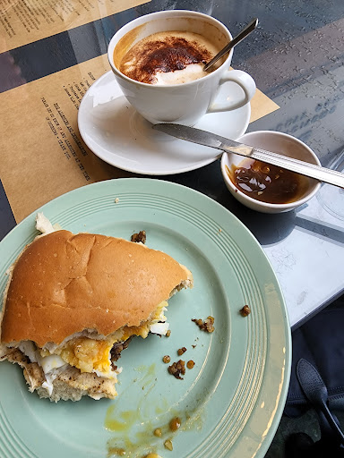 Photos are of a breakfast sandwich. With Veggie haggis, eggs and delicious brown sauce on the side. Oh and a coffee! They do have non dairy milk...